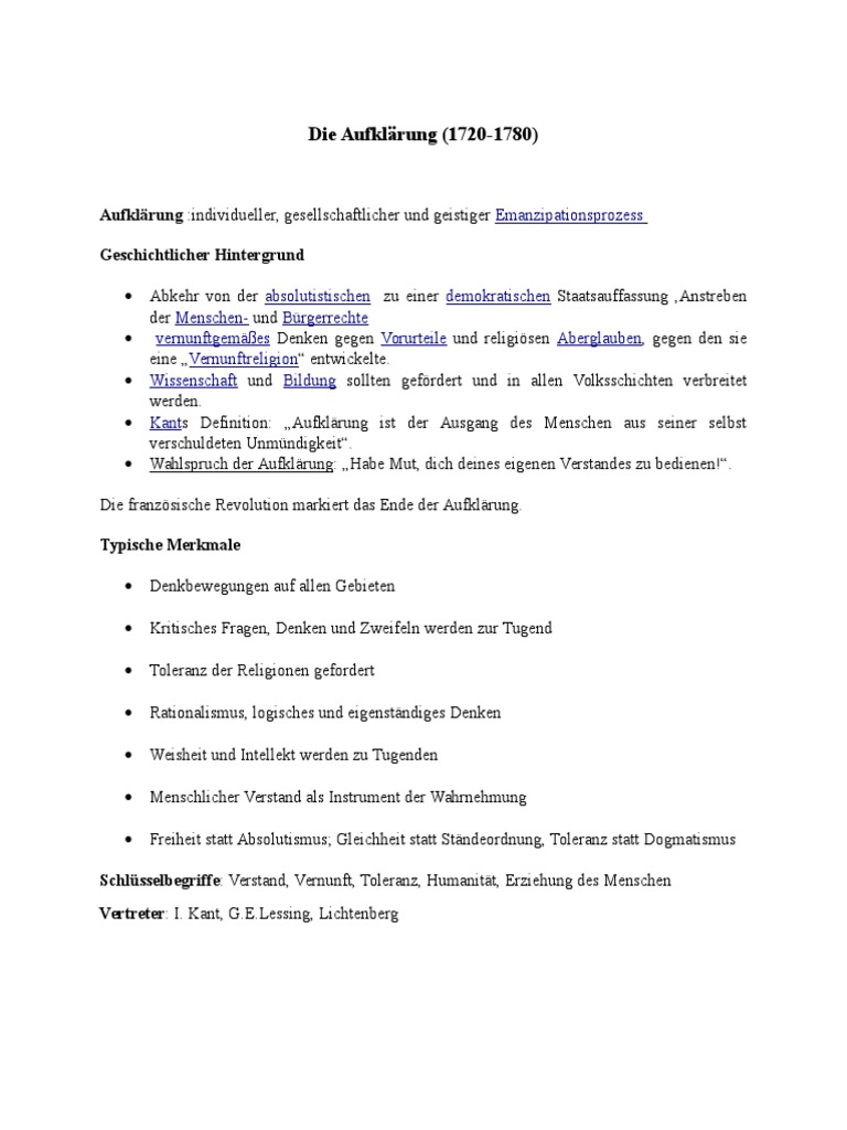 Zur selben Zeit Verfasste Goethe die erste Fassung Der Iphigenie. Die Buerger sind nicht laenger bereit die Vorherrschaft des Adels in politischer sowie kultureller Hinsicht hinzunehmen. Lessings Stueck Nathan der Weise ist ein typisches Werk der Aufklaerung in dem der Autor die Wunschvorstellung eines friedlichen Miteinanders von Judentum Christentum und Islam entwirft.
